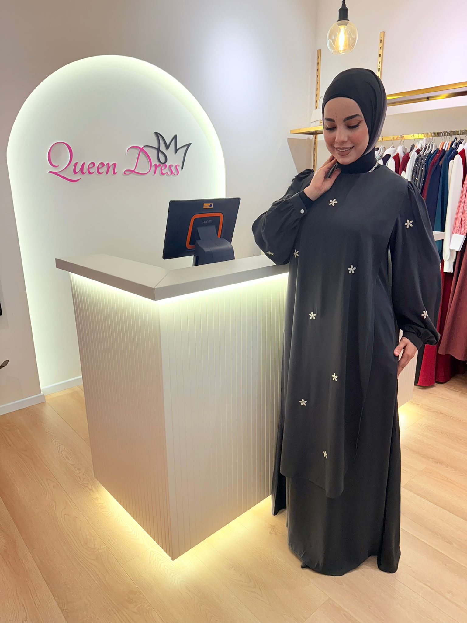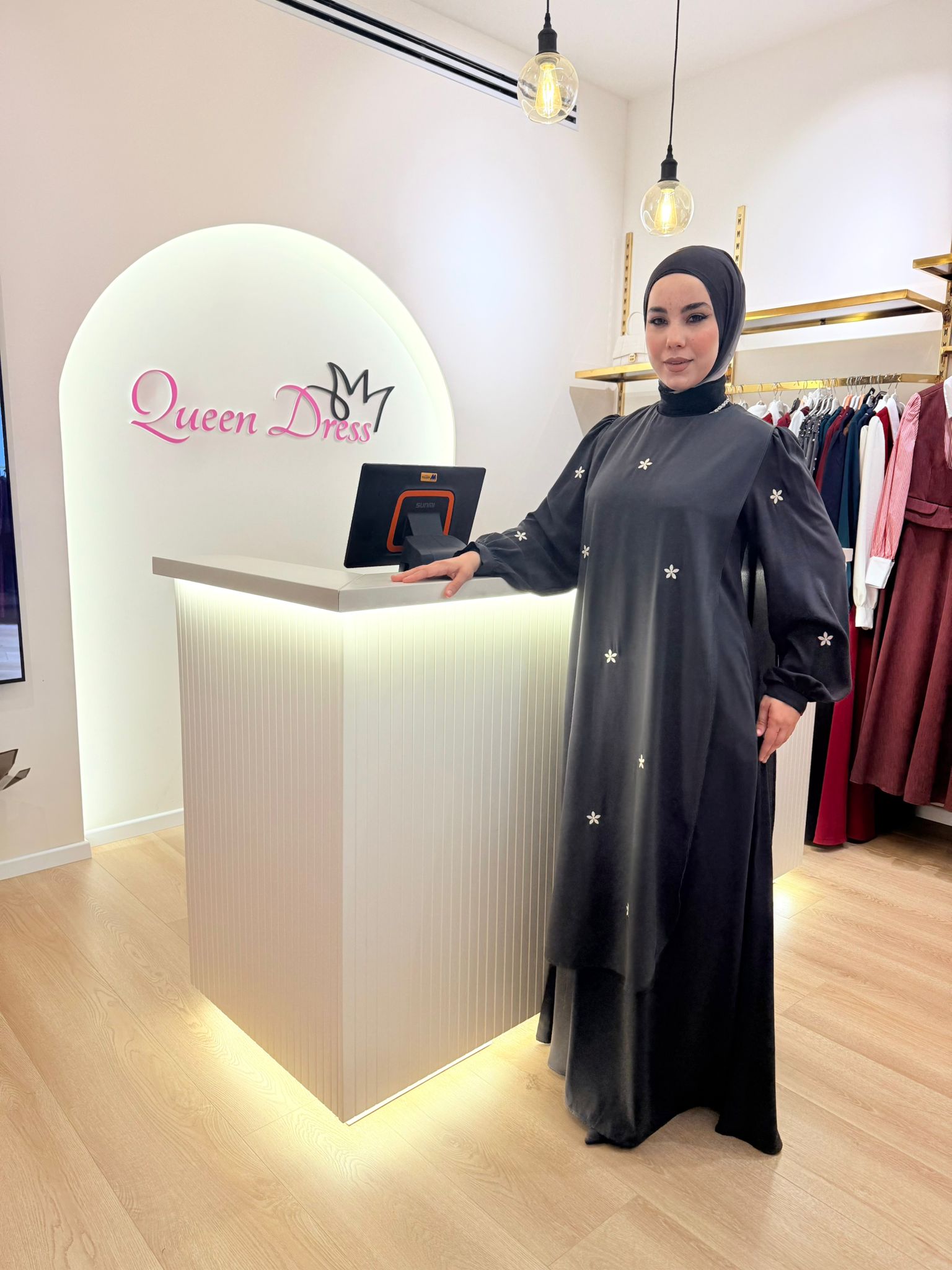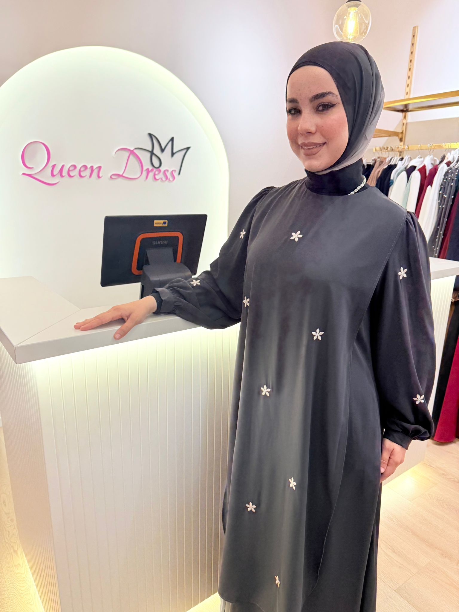 فستان مورّد واسع، بارد، ومريح على اللبس. مناسب للبس اليومي والخروج من البيت.